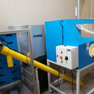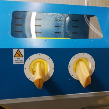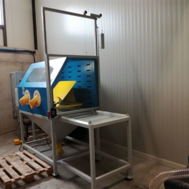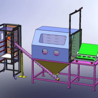 Operater na voziček postavi vreče s filtrirnim ogljem in jih zapelje v komoro. Zapre dvižna vrata, vklopi odsesovalni sistem, natakne zaščitne rokavice in začne z odpiranjem vreč in polnjenjem zalogovnika. Ko je zalogovnik oglja poln se operater prestavi na delovno mesto za polnjenje vreč (k nasipalni komori). Tam z nožno stopalko krmili delovanje vijačnega transporterja in s tem količino nasutega oglja v filtrirno vrečko. Odsesovalni sistem skrbi za odsesovanje odvečnega prahu pri polnjenju.