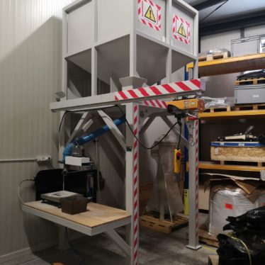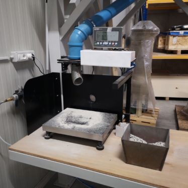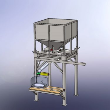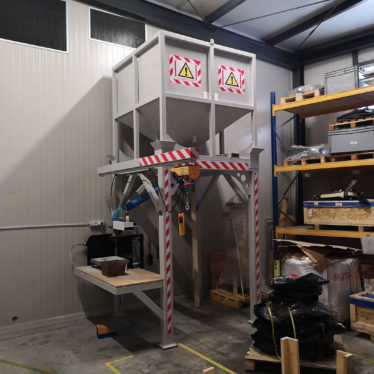 Nad mizo je pomično vpeto električno dvigalo, ki omogoča prenos polnih vreč iz delovne mize na paleto. Zalogovnik se s pomočjo viličarja sname iz stojala ter postavi na tla, kjer se ga napolni z granulatom, nato se ga ponovno postavi na stojalo. Operater s pnevmatsko nožno stopalko preko pnevmatskega cilindra odpira dozirni ventil ter v vreče spušča željeno količino granulata. Odsesovalni sistem skrbi za sesanje odvečnega prahu pri sipanju granulata v vreče.