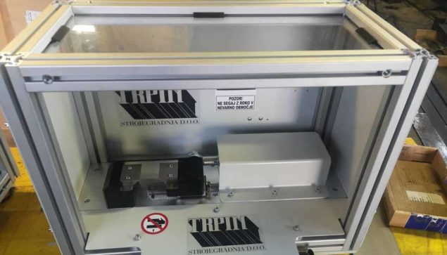 Stroj za krivljenje ALU-profilov (CNC krivljenje) za obrobe prometnih znakov. Poteka avtomatsko, operater je na varni razdalji za varnostno optično zaveso.